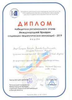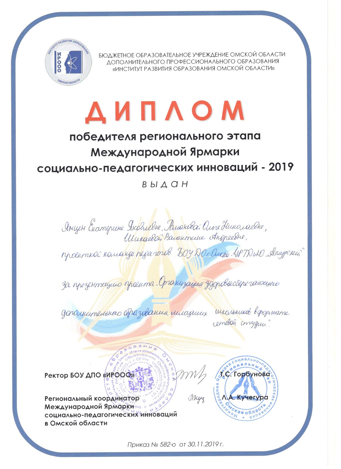30 ноября 2019 года в Институте развития образования Омской области прошел Региональный этап Международной Ярмарки социально-педагогических инноваций-2019, в котором приняли участие команда наших педагогов Янцен Е.Я., Романова О.Н. и Шикаева В.А. с проектом «Организация здоровьесберегающего дополнительного образования младших школьников в формате сетевой студии» заняли I место.